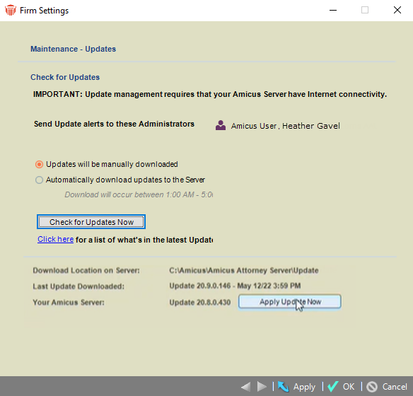 - If your firm has not been updated to Amicus 20.9, click the Apply Update Now button that displays in the Maintenance - Updates dialog.