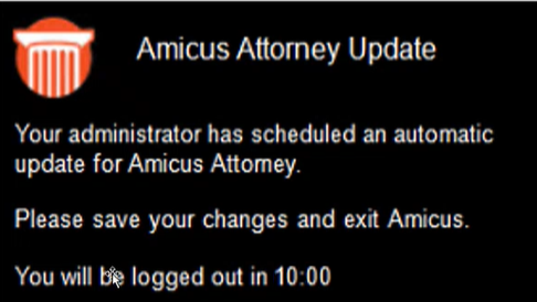 - A toast message pops up at the bottom of all workstations informing users that their Administrator has scheduled an automatic update for Amicus Attorney. Users are asked to save their changes and log out of Amicus Attorney. If they do not, they are automatically logged out after the default time of 10 minutes.