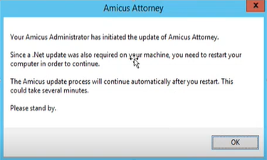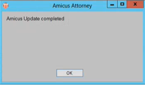 - After the update is complete, a prompt message displays notifying users that Amicus has been updated. Click OK.