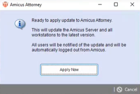 - Click Apply Now if you are ready to apply the update to Amicus Attorney. The update starts automatically.