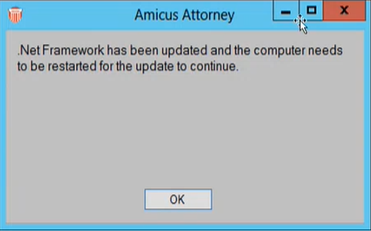 - If a firm member did not have .NET Framework 4.8 installed on their workstation a prompt message displays informing them that .NET Framework has been updated, and they need to reboot their computer for the update to continue.