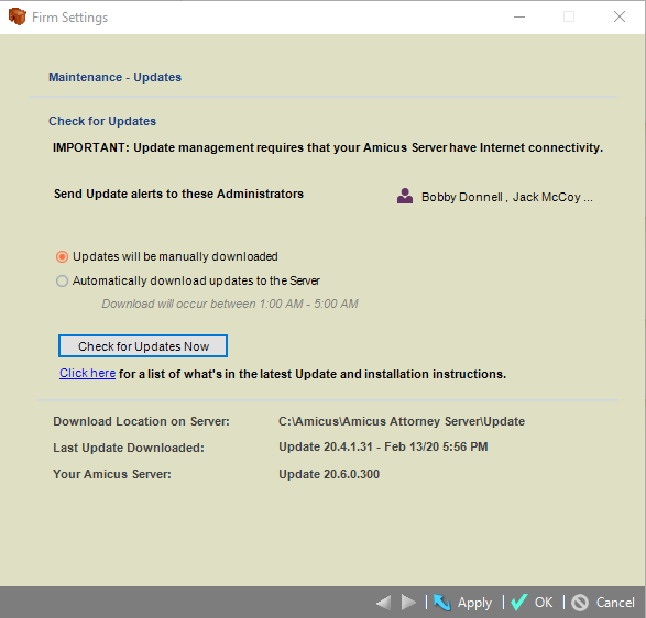 Choose whether Updates will be automatically downloaded overnight, or you'll manually download them when desired. Note that updates to your Amicus Server are not automatically applied as it may be necessary to first log all users out and shut down the Amicus Services.