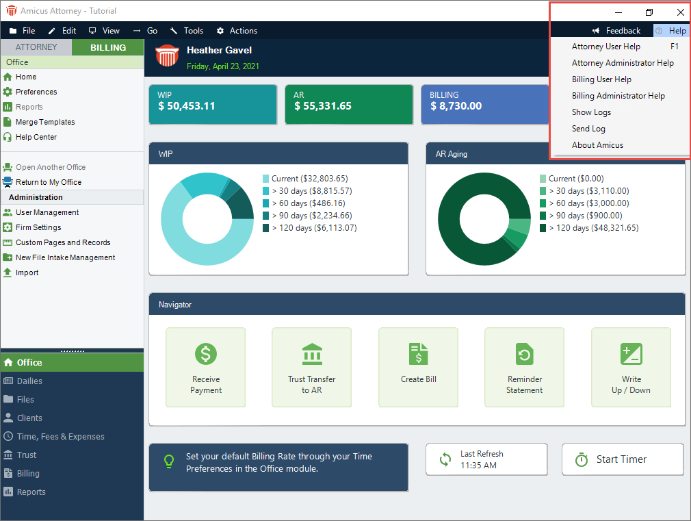 Click Office > Help Center to view the Amicus Help Center. Here you will find User and Administrator Help to supplement the main help, as well as Support, Contact Information and Other Resources, or check the Amicus Attorney Technical Resource Guides/Updates section on our website.