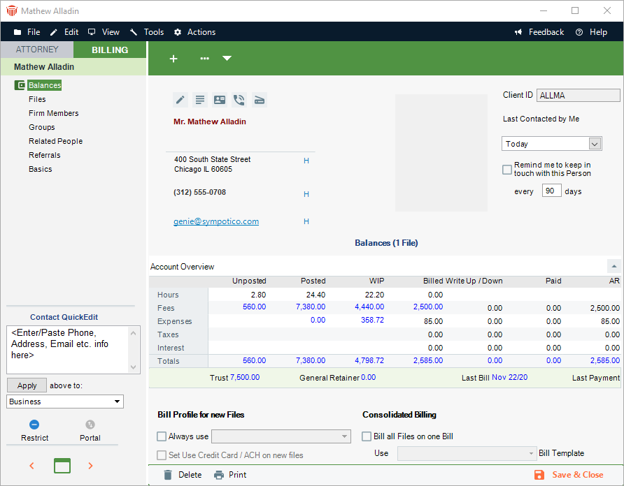 If an account overview value appears underlined when you move the cursor over it, you can drill down to related details. For example, click the WIP Fees amount to display the Time Index filtered to show unbilled Time Entries for this Client. Or click the Last Billed date to display the Billing Index filtered to show Bills for this Client.