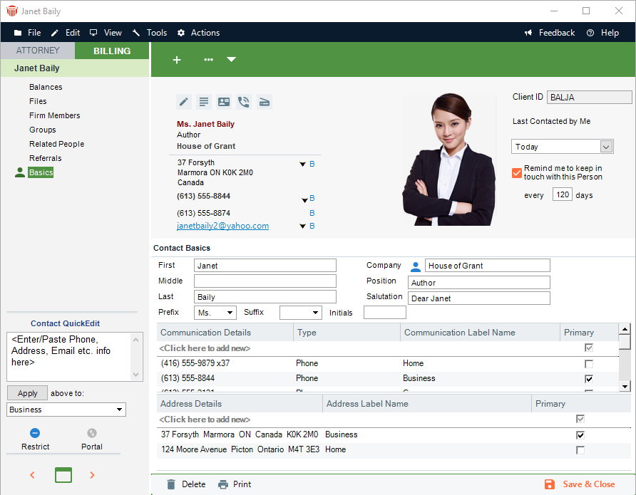 As on the Attorney side, basic information for a Contact may be added and edited in the Basics view of the Contacts Details dialog: name, addresses, phone numbers, and so on. You can quickly add information about the Contact from the QuickEdit section in the control panel. You can use the Client's Business Card, work with their picture, and use their Last Contacted date.